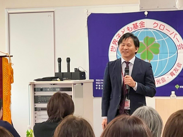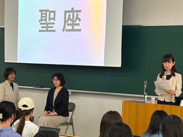 聖座、校歌、清友会の紹介を見ていただき、熊谷恵利子さん(高校45回・大人関19回)に動画にて講演していただきました。