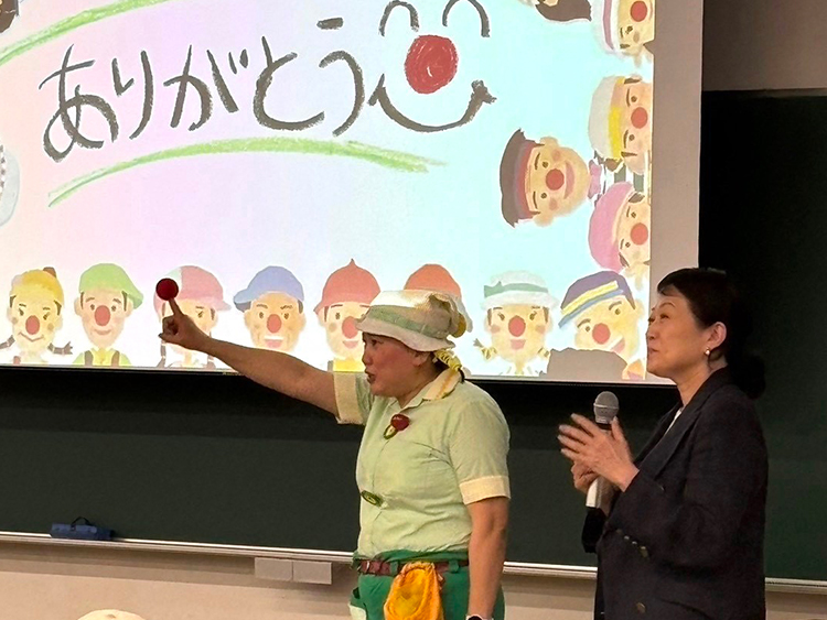熊谷さんは現在、クリニクラウン協会に勤務、事務局長として様々な分野で活躍されています。ノンバーバルコミュニケーションを通して、人とのコミュニケーションの大切さを伝えていただきました。学生の皆さんも「笑顔」の力の大きさを実感されたことと思います。