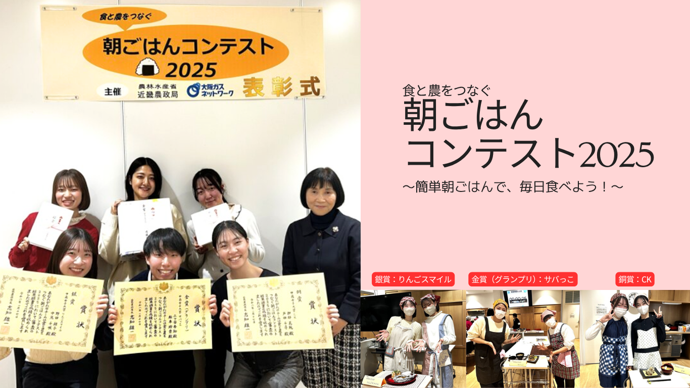 本コンテストは、 食や地元近畿の有機農産物への関心を高め、学生が朝ごはんメニューを考案・調理することを通じて、環境にやさしい消費行動やガス火を使った効率的な調理を促すことを目的として開催されました。多様な視点から提案された朝ごはんメニューが審査され、濵口ゼミの取組は、その独自性やテーマに沿った内容が高く評価を受け、複数の賞を受賞する結果となりました。