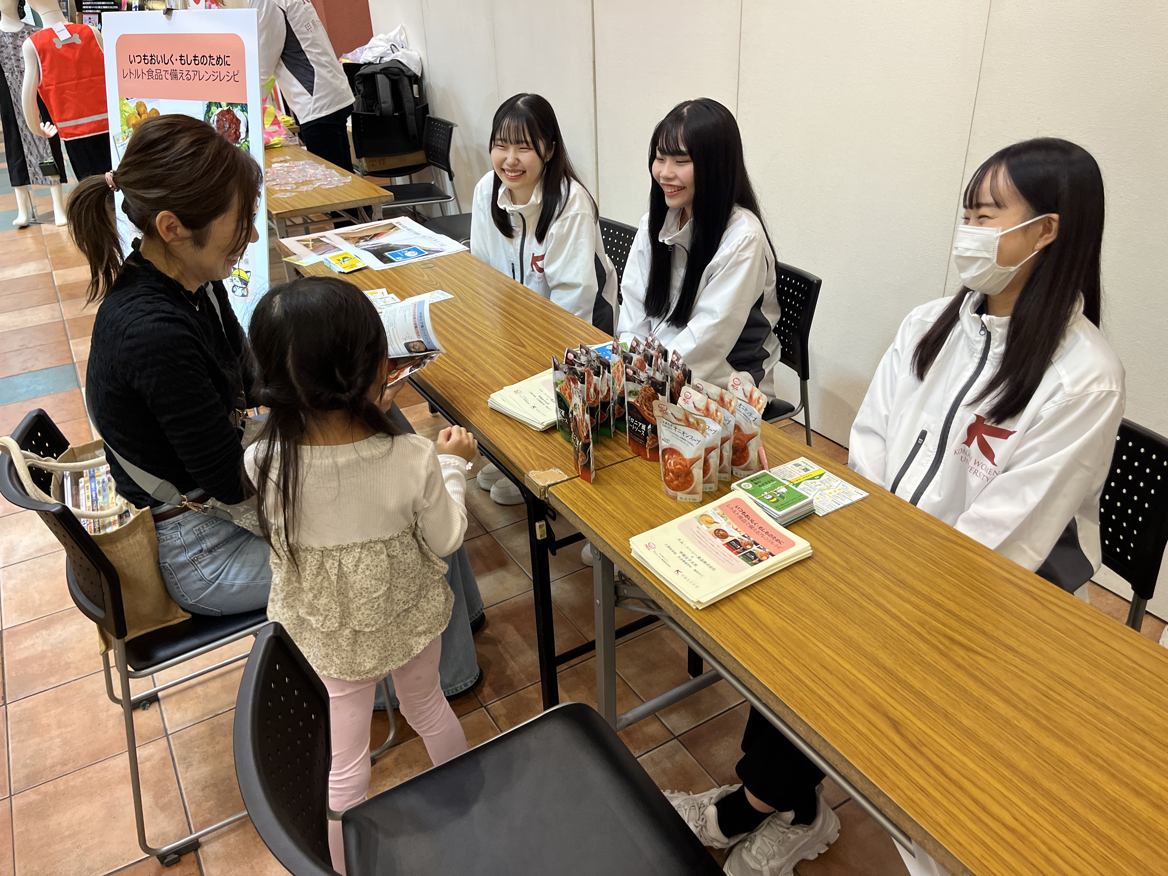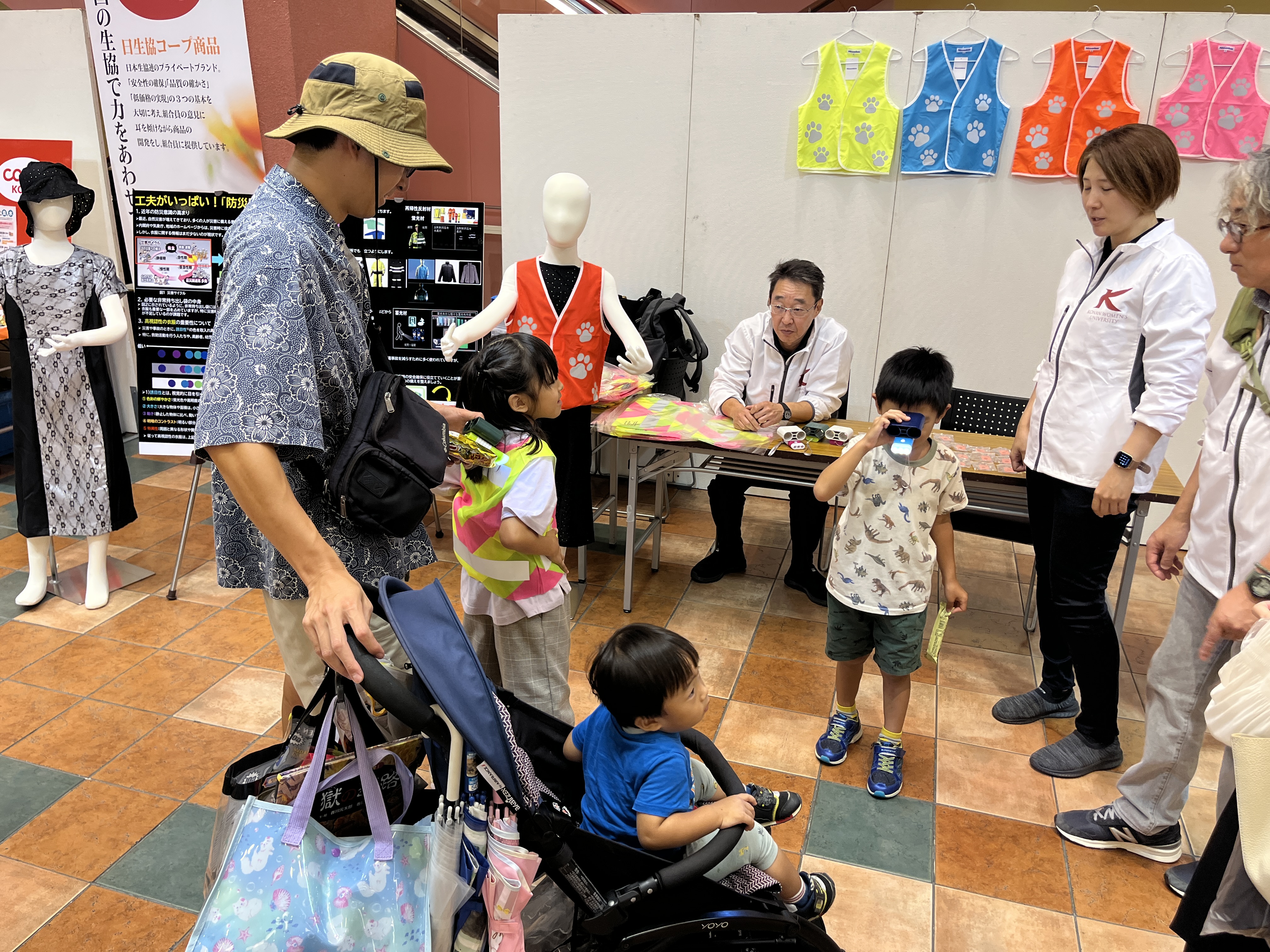 人間科学部生活環境学科では、減災を学び体験できる「カードで楽しく学ぶ!『防災食』」や、安全のための高視認性の服を紹介する「視認性が高い素材を用いたベストの着用体験/展示」、また社会連携課学生スタッフʼhimawariʼによる防災ワークショップを実施しました。