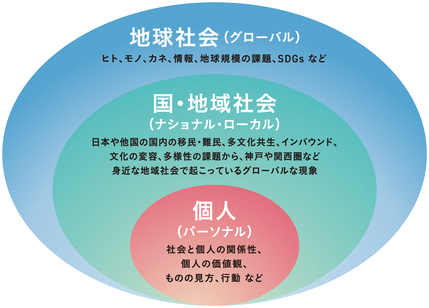 地球社会、国・地域社会、個人の異なる3つの領域を