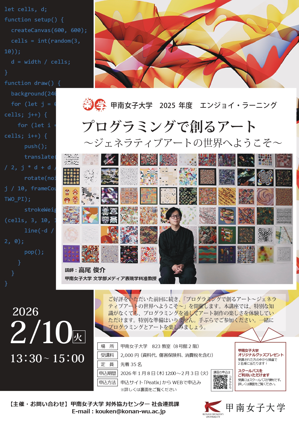 本講座では、特別な知識がなくても、プログラミングを通してアート制作の楽しさを体験していただけます。オープンソースソフトウェア「p5.js」を使えば、難しいコードを書かなくても、線や図形を組み合わせて、オリジナル作品を生み出すことができます。作品はデータとして保存できるので、プリントアウトして飾ったり、Tシャツにデザインしたりと、さまざまな楽しみ方ができます。一緒に楽しみながら、プログラミングとアートの世界を体験しましょう。