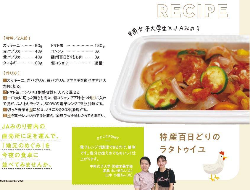 その経験を基に、「高齢者や子どもにも食べやすい」「簡便性」「兵庫県産食材の活用」といった視点を考慮しながら、播州百日どりのうま味を生かしたレシピ開発を行い、その成果がJAみのりの広報誌(ねっとわーくMINORI 2025年9月号)に掲載されました。