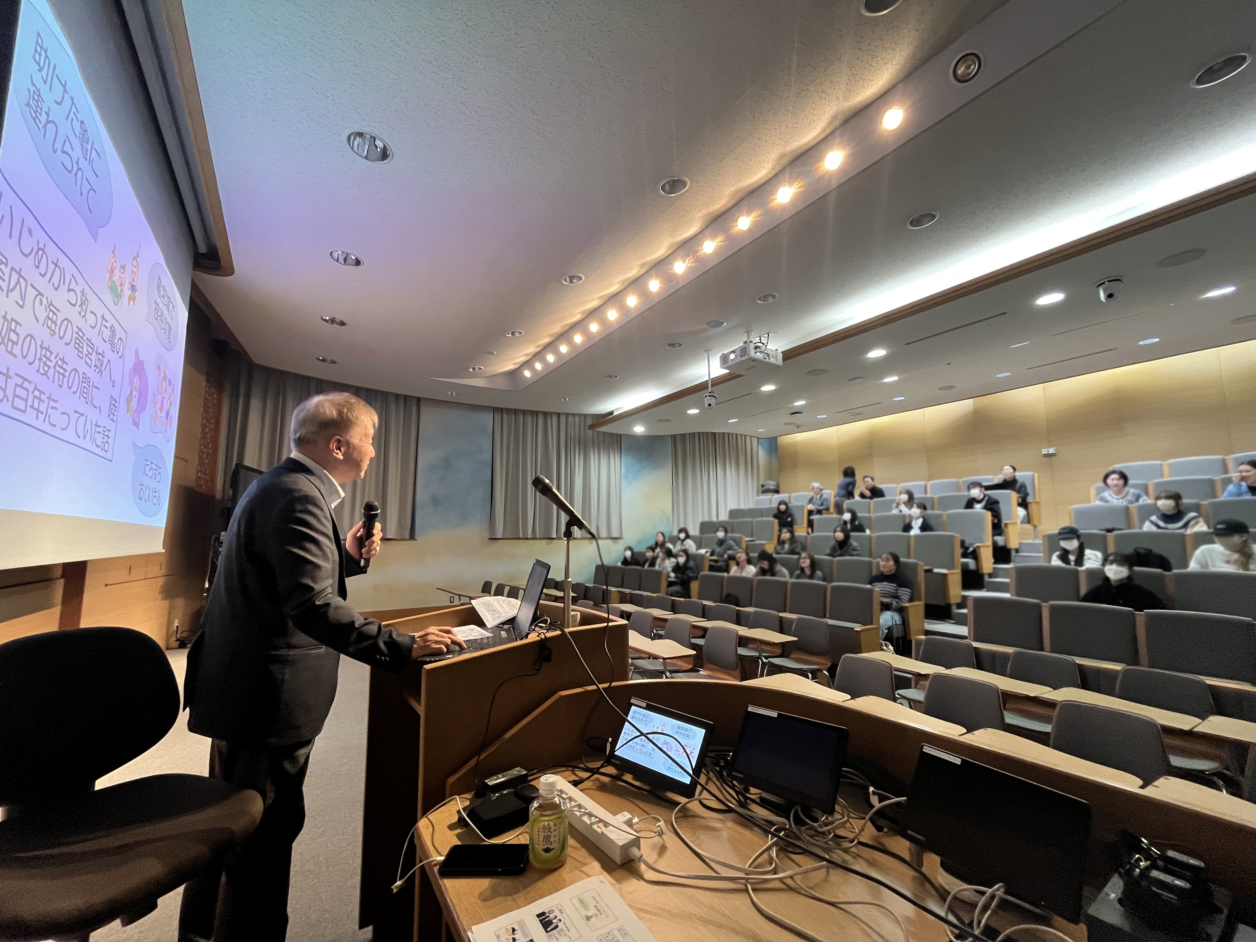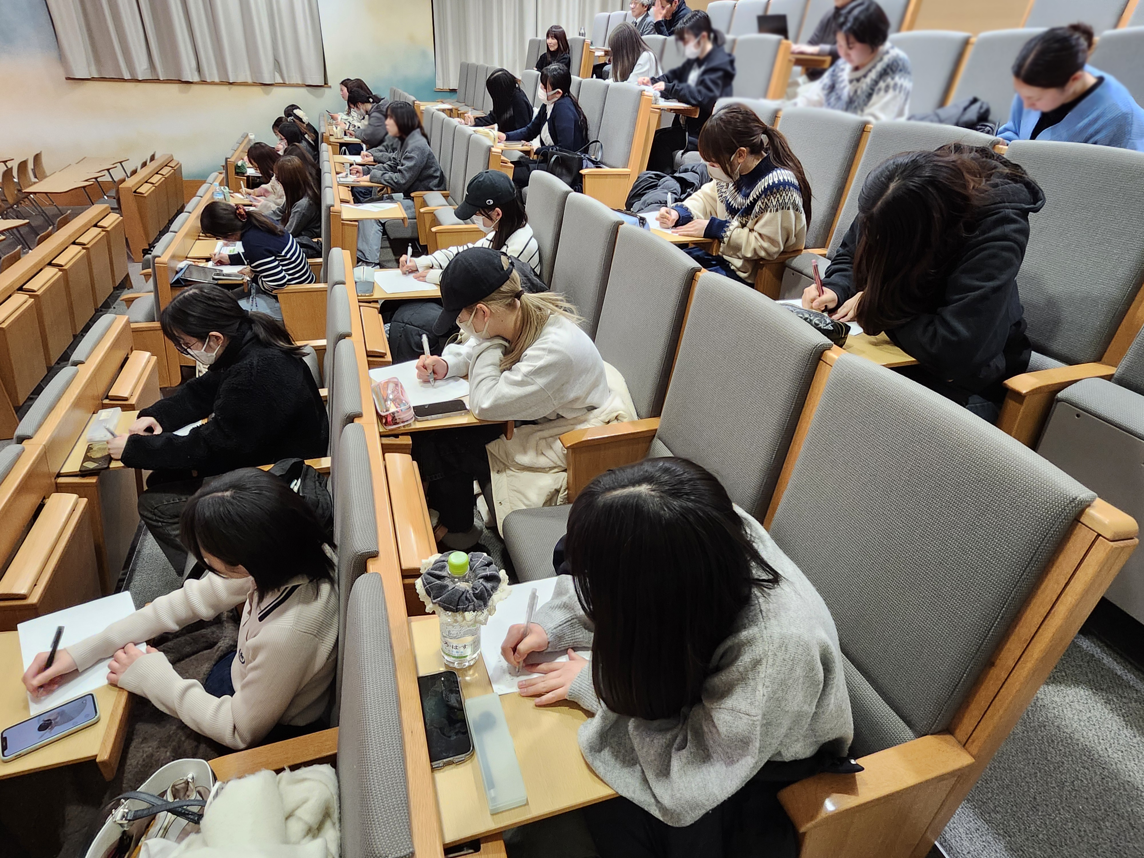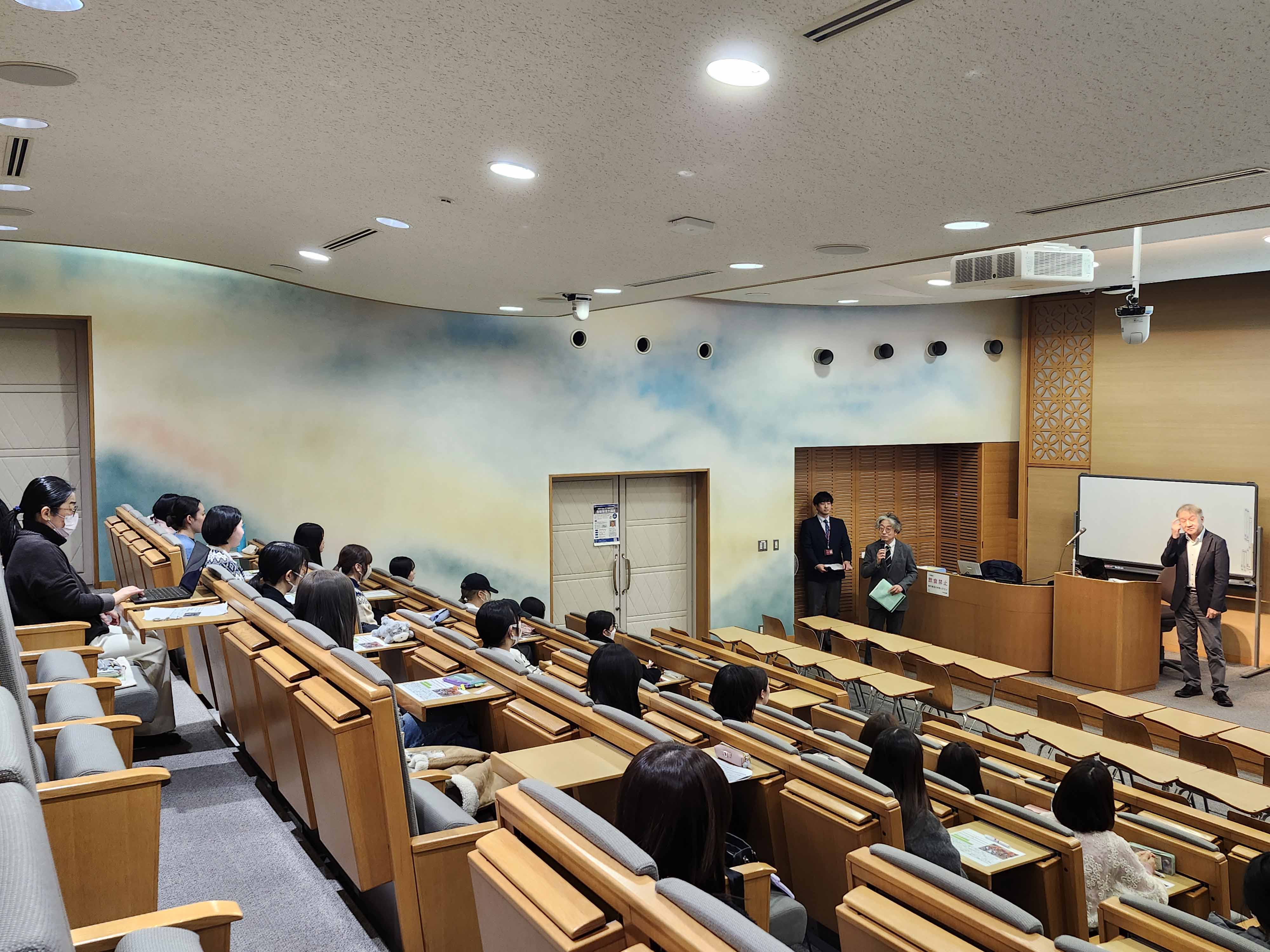 本講座は、情報発信力の向上と卒業論文やレポート作成において、AI(人工知能)に頼るのではなく、自ら「読み、考え、まとめ、書く力」を育んでもらうことを目的に開催し1~4年生の本学学生約30人と教職員が参加しました。