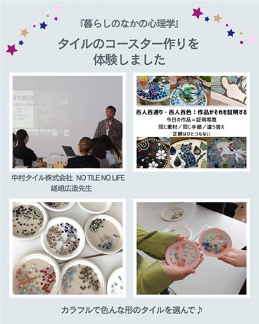 先日、『暮らしのなかの心理学』の授業で、ゲストスピーカーとして中村タイル株式会社 NO TILE NO LIFEの嵯峨広造先生をお招きして、小さなタイルを使ったコースター作りのワークショップを開催していただきました。