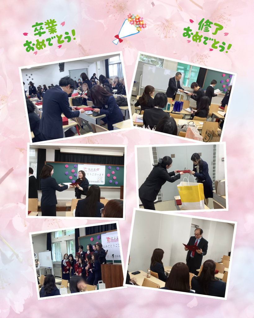 式のあとの集いの教室では、ゼミの先生から一人一人に学位記を授与していただき、みんなとても晴れやかないい笑顔だったのが印象的でした