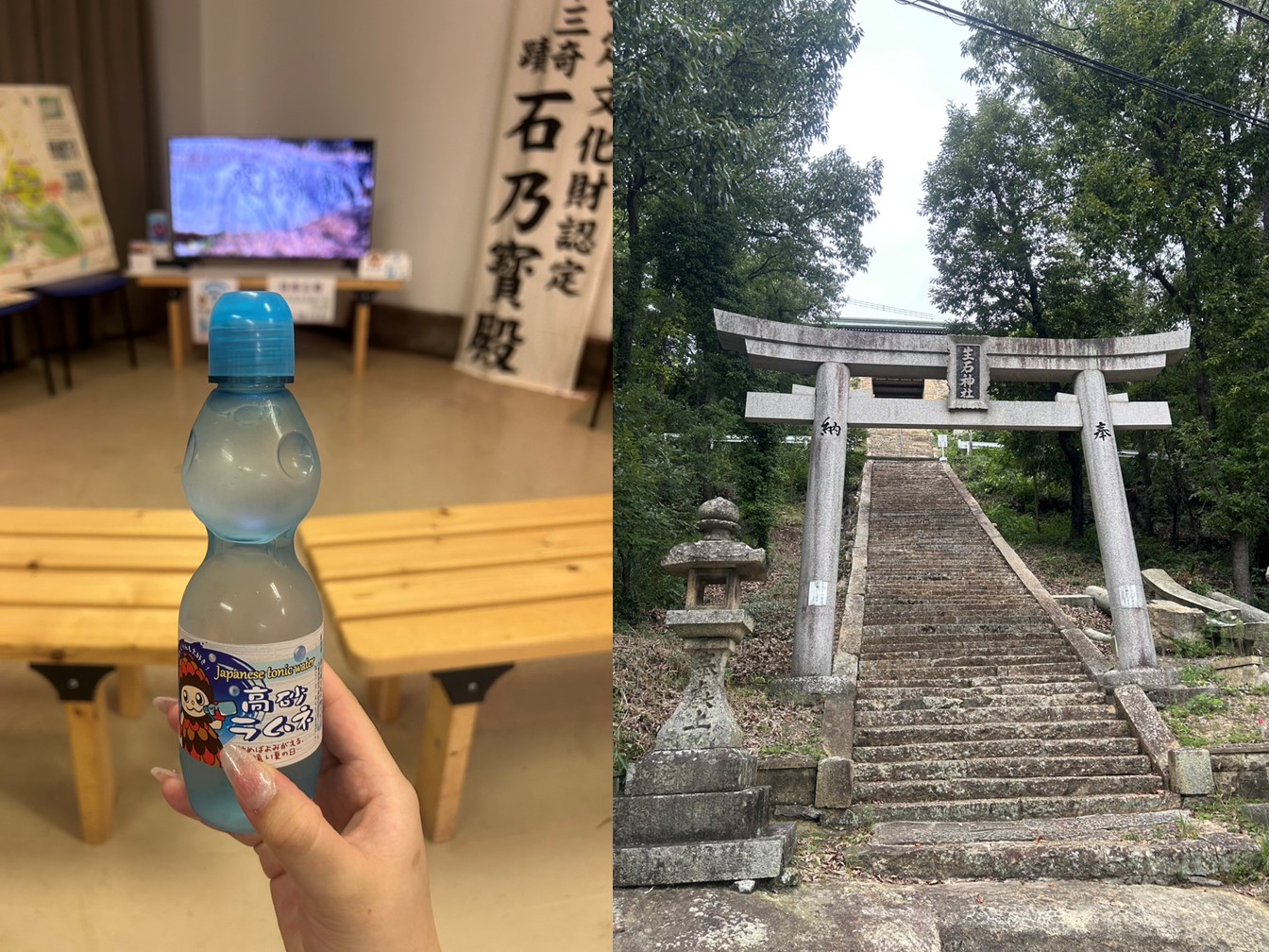 生石神社近くのお土産屋さんでは、高砂市産の卵を使用したジェラートや高砂ラムネが販売されていて、私たちもいただきました。濃厚でとても美味しかったです