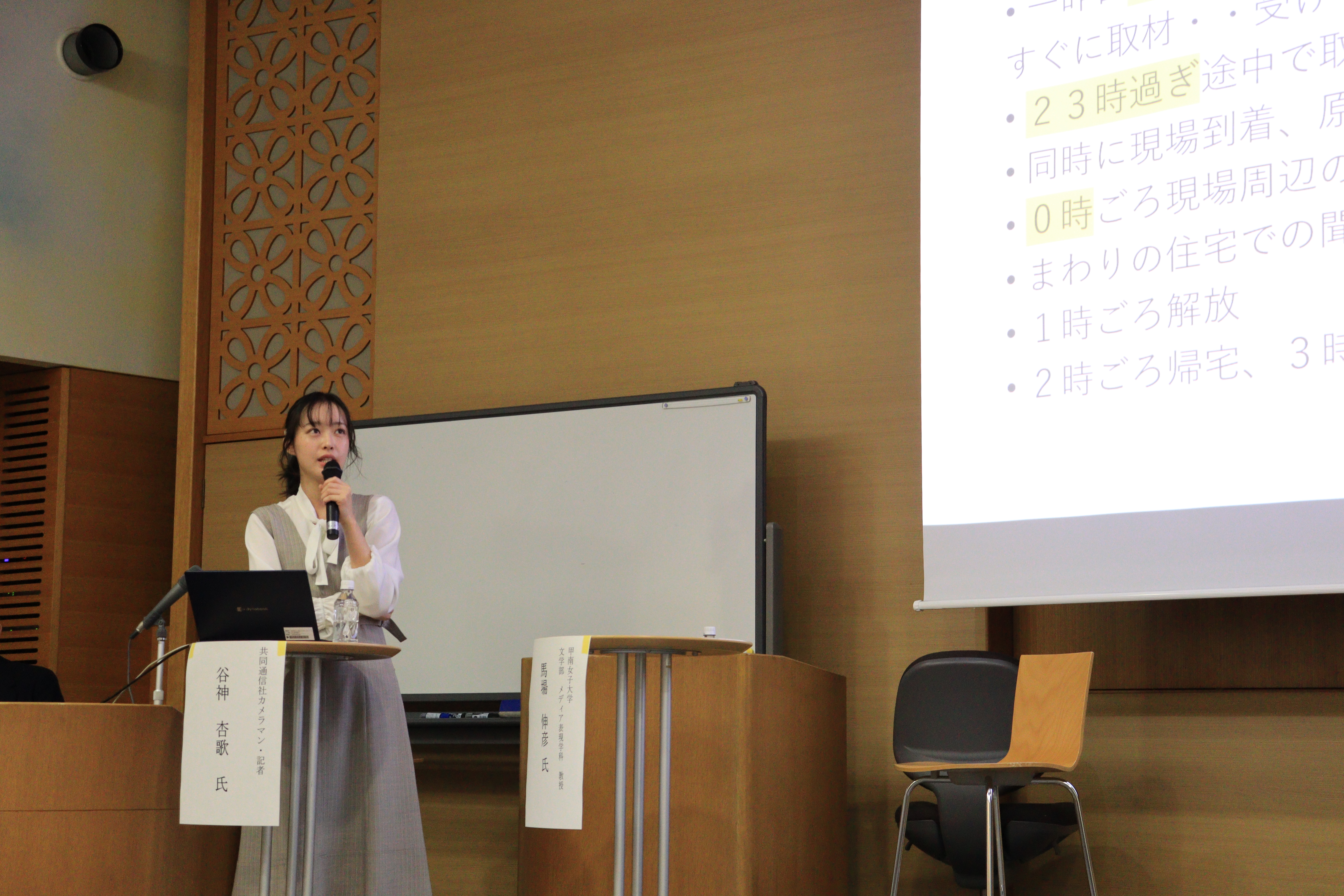 卒業後に新聞記者として働いている体験談をお話いただきました。事実を正確に伝える責任、迅速な対応など具体的に知ることができました。メディア表現を学ぶ学生たちにとって、とても貴重な時間になりました