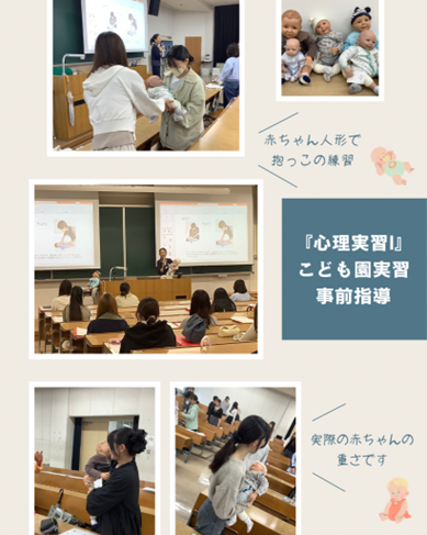 先日「心理実習Ⅰ」の授業で、こども園実習の事前指導を行い、赤ちゃん人形を使って抱っこの練習をしました。