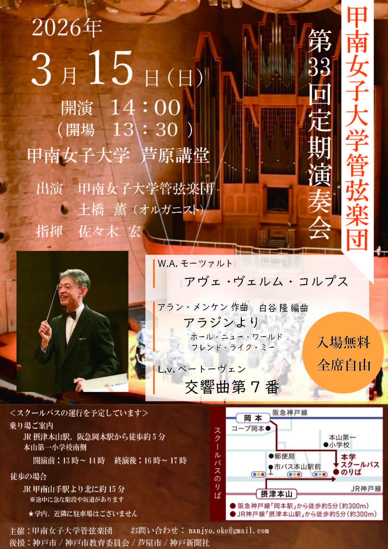 2026年3月15日(日)、甲南女子大学 芦原講堂にて管弦楽部主催「第33回定期演奏会」を開催します。