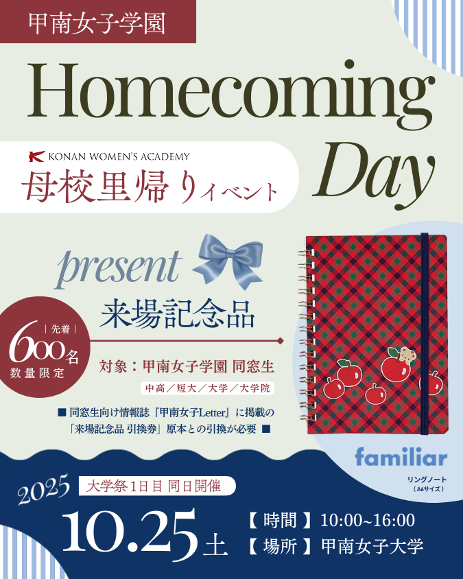 ■ 先着600名様 (※9/19更新) 甲南女子学園より来場記念品をプレゼントします。今年の記念品は、ファミリアのリングノート(A6サイズ)です。スクールカラーともリンクするファミリアチェック柄が魅力。神戸らしさと甲南女子らしさが詰まったアイテムをご用意しています。(※数量限定。提供冊数に達し次第配付終了) ■ 引換方法 9月中旬発送の同窓生向け情報誌『甲南女子Letter』に掲載の「引換券」(18ページ)を切り取って、必要事項をご記入のうえ、ホームカミングデー当日に受付へお持ちください。 ■ 対 象 「引換券」をお持ちの同窓生ご本人様(お1人様1つ)に限ります。※コピー不可 |