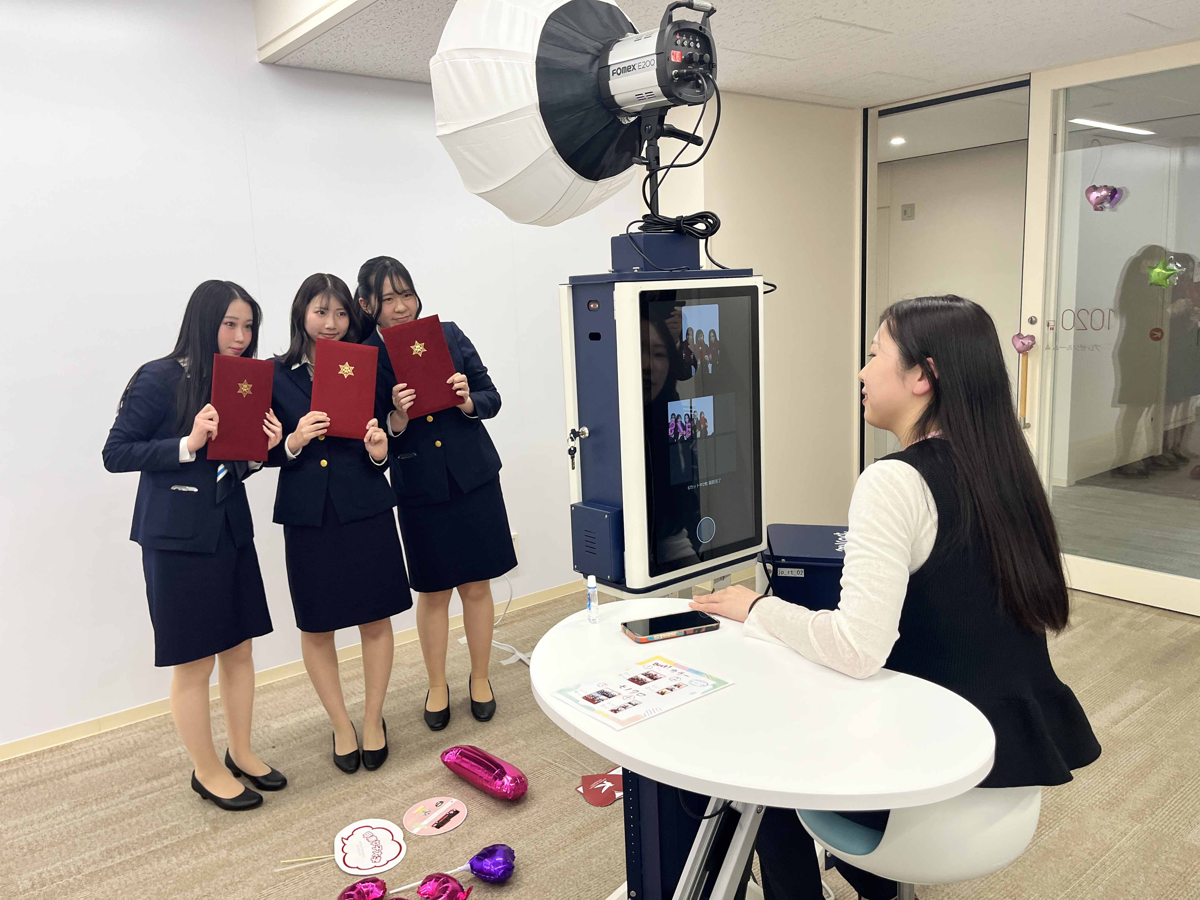 ミラート社の「PHOTO AIR」を活用したセルフフォトブースを卒業式会場に設置し、撮影した写真をオリジナル台紙に仕立て、メッセージを添えて手渡す形の卒業記念品を実現しました。